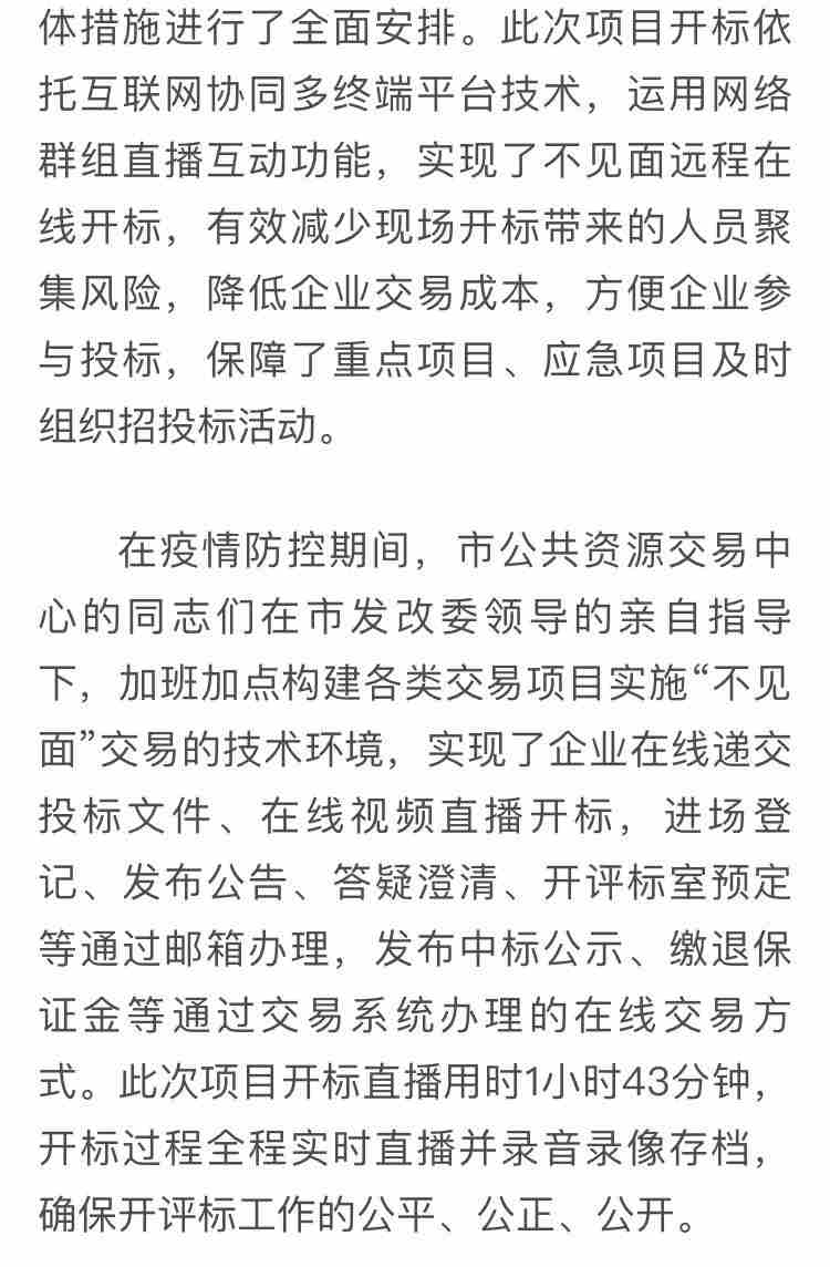 自抗擊疫情阻擊戰打響以來,我公司積極響應國家發改委《關于積極應對疫情創新做好招投標工作保障經濟平穩運行的通知》(發改電《2020》170號)、財政部《關于疫情防控期間開展政府采購活動有關事項的通知》(財辦庫《2020》29號)、市公共交易中心《疫情防控期間政府采購項目“不見面”開標工作辦法》等有關通知。公司全員一致高度重視,并在各級政府的關心和大力支持下,我司積極探索、主動承擔起了西安市首例電子化“不見面”開標模式,為了確保本次招標項目順利進行,我司領導與招標人、監管部門及市公共資源交易中心進行了深入的探討和溝通,并進行了多次模擬演練,于2020年2月25日上午在西安市公共資源交易中心順利實施了全過程電子化“不見面,在線視頻直播”的方式,對《臨潼渭北工業區標準工業廠房設計施工總承包》工程項目進行了公開招標(后附西安新聞網及發改委等有關官方報道)。